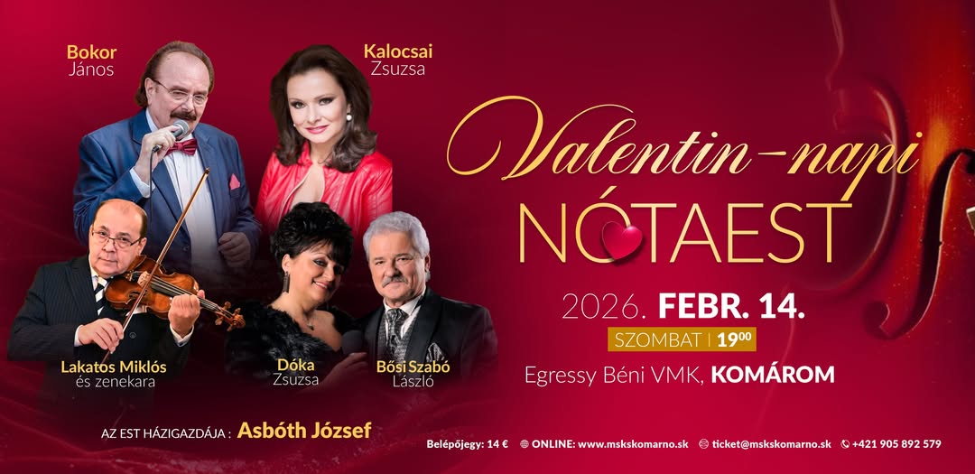 A komáromi Egressy Béni Városi Művelődési Központ tisztelettel értesíti a község lakosságát, hogy 2026. február 14-én (szombat), 19:00 órai kezdettel szervezi meg a Valentin napi nótaestet. Az este folyamán magyarnóta-irodalom legszebb szerelmes gyöngyszemei hangzanak el a legkiválóbb hazai és magyarországi szólisták előadásban. Az est énekes szólistái Kalocsai Zsuzsa Bokor János, Dóka Zsuzsa, Bősi Szabó László. A házigazda szerepében pedig Asbóth József, a Duna TV egykori műsorvezetőjét láthatja a közönség. A zenei kíséretet Lakatos Miklós és zenekara biztosítja. A belépőjegy ára 14€, az igazoltan egészségkárosultak, azaz a ZŤP-igazolvánnyal rendelkezők részére pedig kedvezményes, 10 €-s jegyet biztosítanak. Jegyek kaphatók az Egressy Béni Városi Művelődési Központ jegypénztárban minden hétköznap 12:30 és 15:30 óra között, vagy megválthatók online a www.mskskomarno.sk weboldalon.